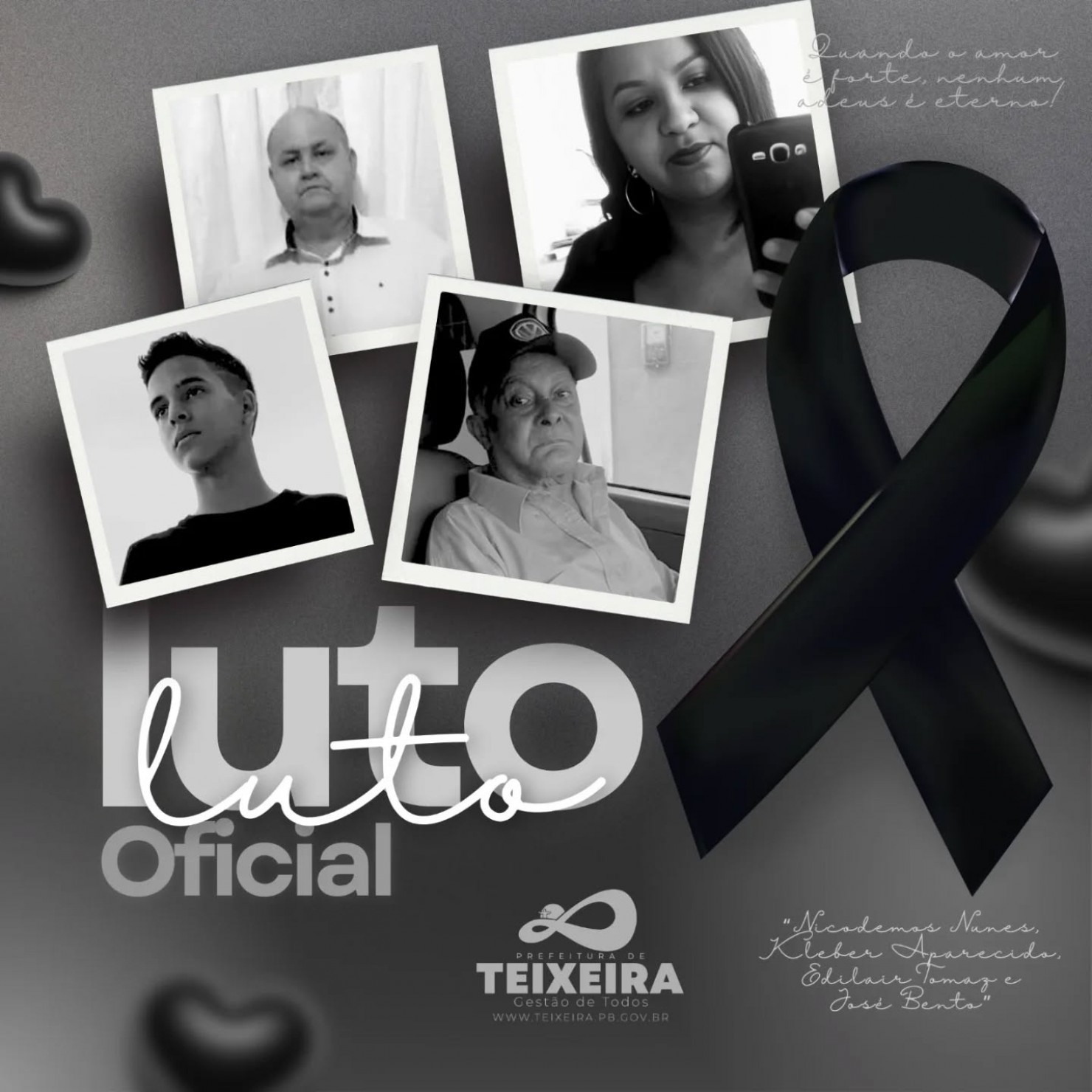 O prefeito Wenceslau Marques, decreta luto oficial de 3 dias no município de Teixeira, em sinal de pesar e respeito pelos falecimentos de: Nicodemos Nunes, Kléber Aparecido Coelho, Edilair Tomaz da Silva e José Bento Alves.