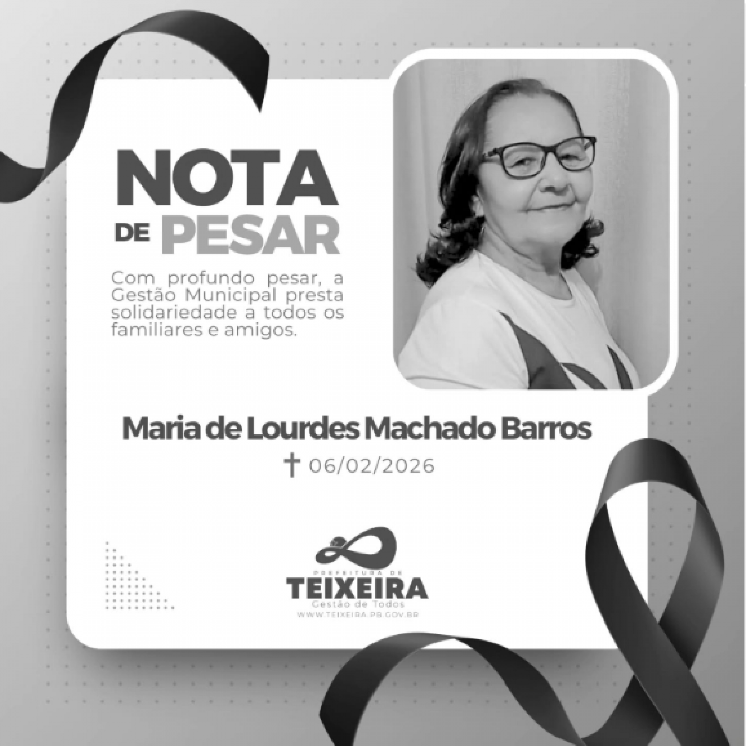 A Prefeitura Municipal de Teixeira, manifesta seu mais profundo pesar pelo falecimento da senhora Maria de Lourdes Machado Barros, ocorrido nesta sexta-feira, 6 de fevereiro.