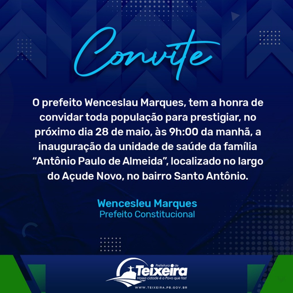 O prefeito Wenceslau Marques, tem a honra de convidar toda população para prestigiar, no próximo dia 28 de maio, às 9h:00 da manhã, a inauguração da Unidade de Saúde da Família “Antônio Paulo de Almeida”, localizado no largo do Açude Novo, no bairro Santo Antônio.