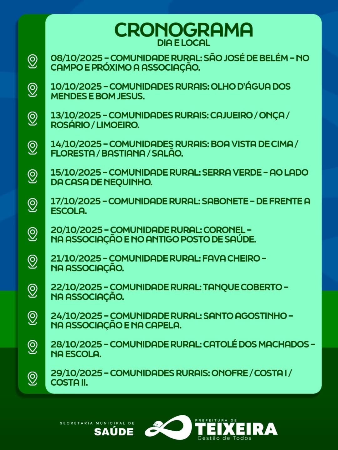 As equipes da vigilância estarão atendendo em locais estratégicos de cada bairro da cidade e também em toda a zona rural, sempre no horário das 8h às 11h30