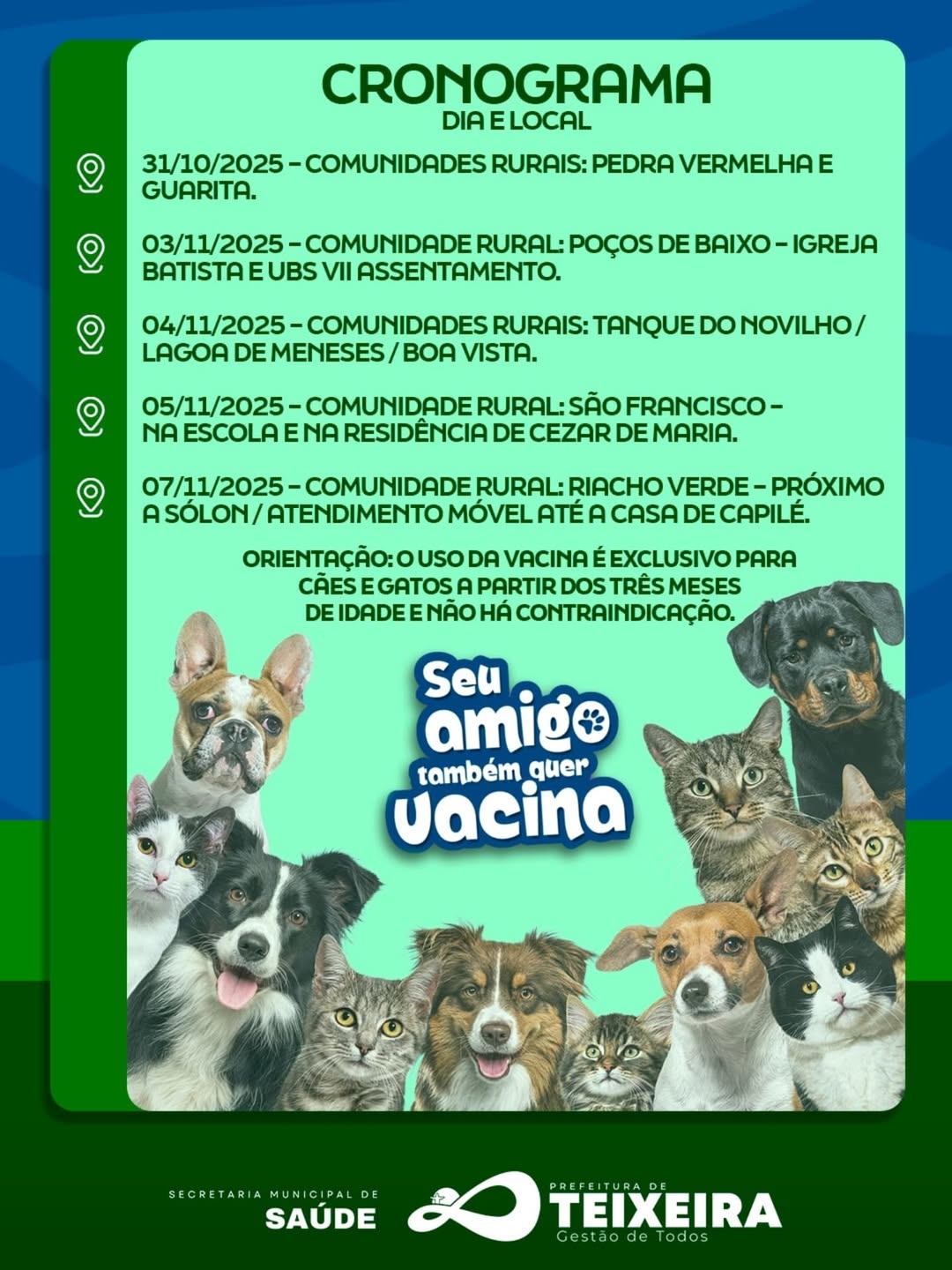 Comunica ainda, que o uso da vacina é exclusivo para cães e gatos a partir dos três meses de idade e não há contraindicação.