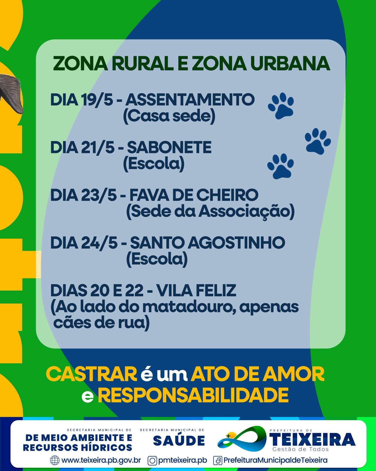 Por meio das secretarias de meio ambiente e recursos hídricos e saúde, a prefeitura de Teixeira realizará um mutirão de castração canina, de 19 a 24 de maio, com atendimento voltado exclusivamente para cães, machos e fêmeas.
