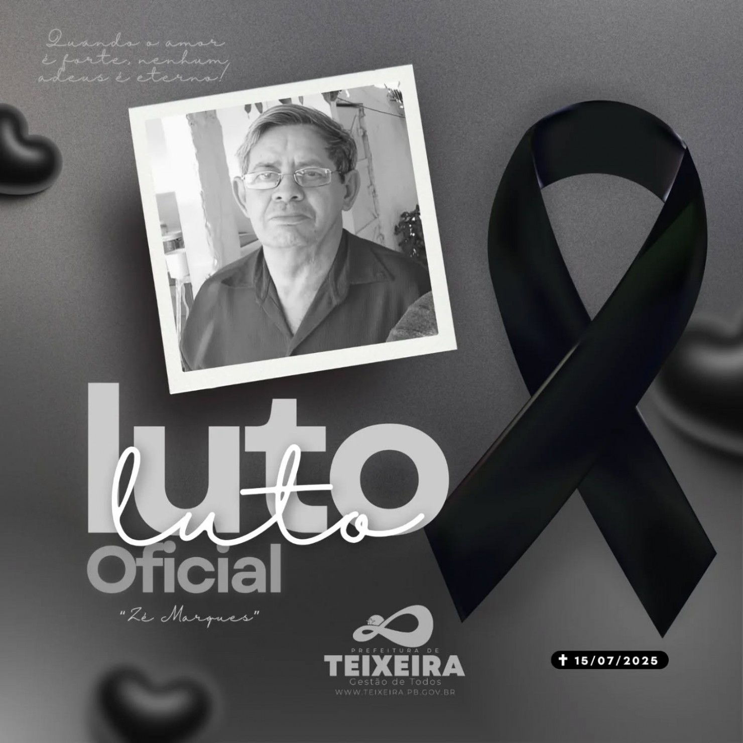 O prefeito Wenceslau Marques, decreta luto oficial no município de Teixeira, em sinal de pesar e respeito pelo falecimento do senhor José Marques de Souza Sobrinho, ocorrido nesta terça-feira, 15 de julho de 2025.