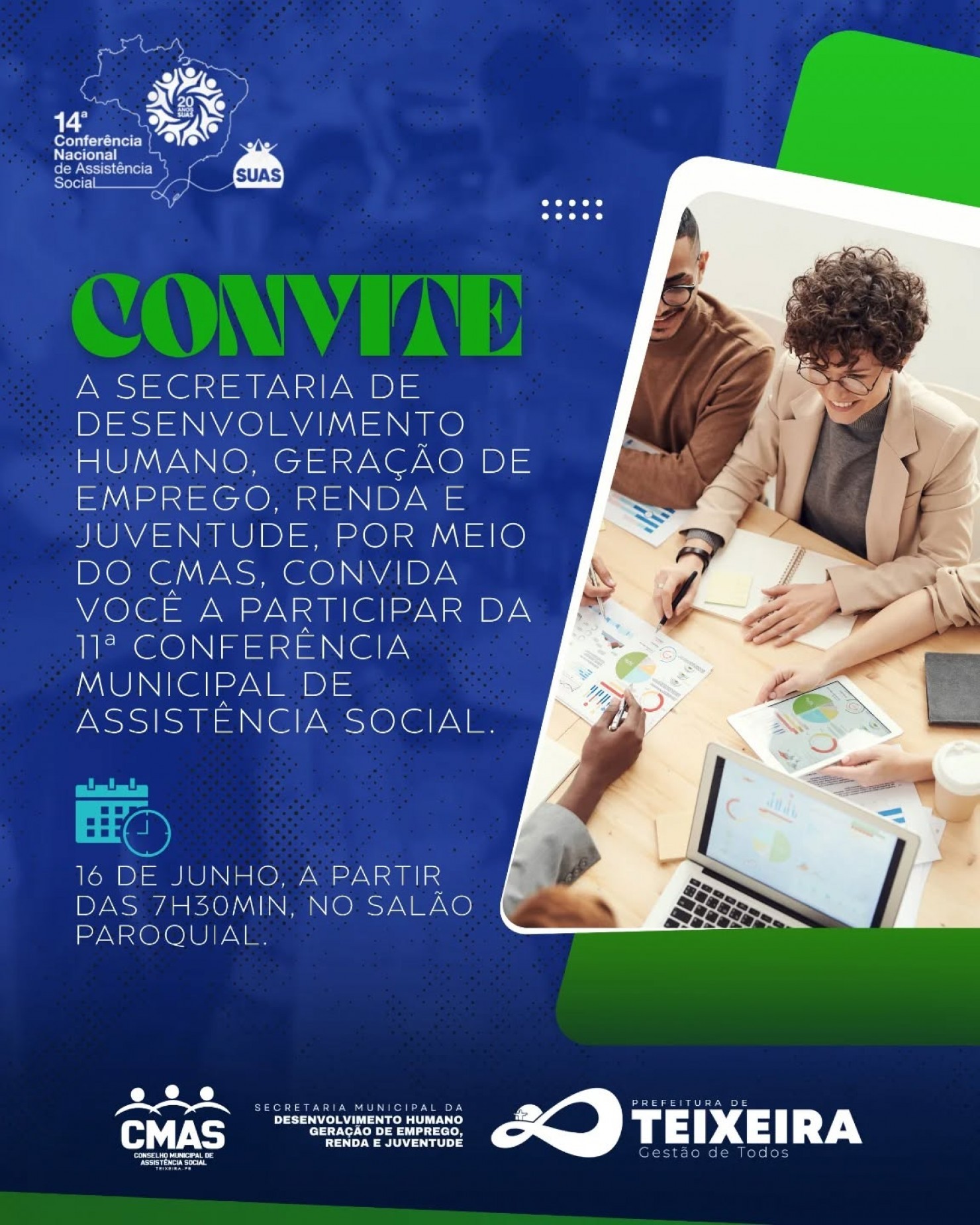 A Prefeitura de Teixeira, por meio da Secretaria de Desenvolvimento Humano, Geração de Emprego, Renda e Juventude e do Conselho Municipal de Assistência Social (CMAS), realiza na próxima segunda-feira, 16 de junho, a 11ª Conferência Municipal de Assistência Social. O evento acontecerá a partir das 7h30, no Salão Paroquial.