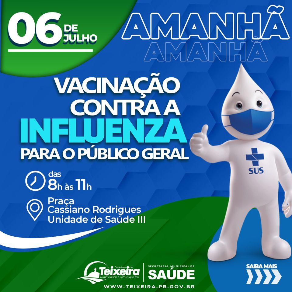 A vacinação se dará tanto na Praça Cassiano Rodrigues, quanto na Unidade de Saúde da Família III (Postinho da Nova Teixeira), respectivamente das 8h às 11h.