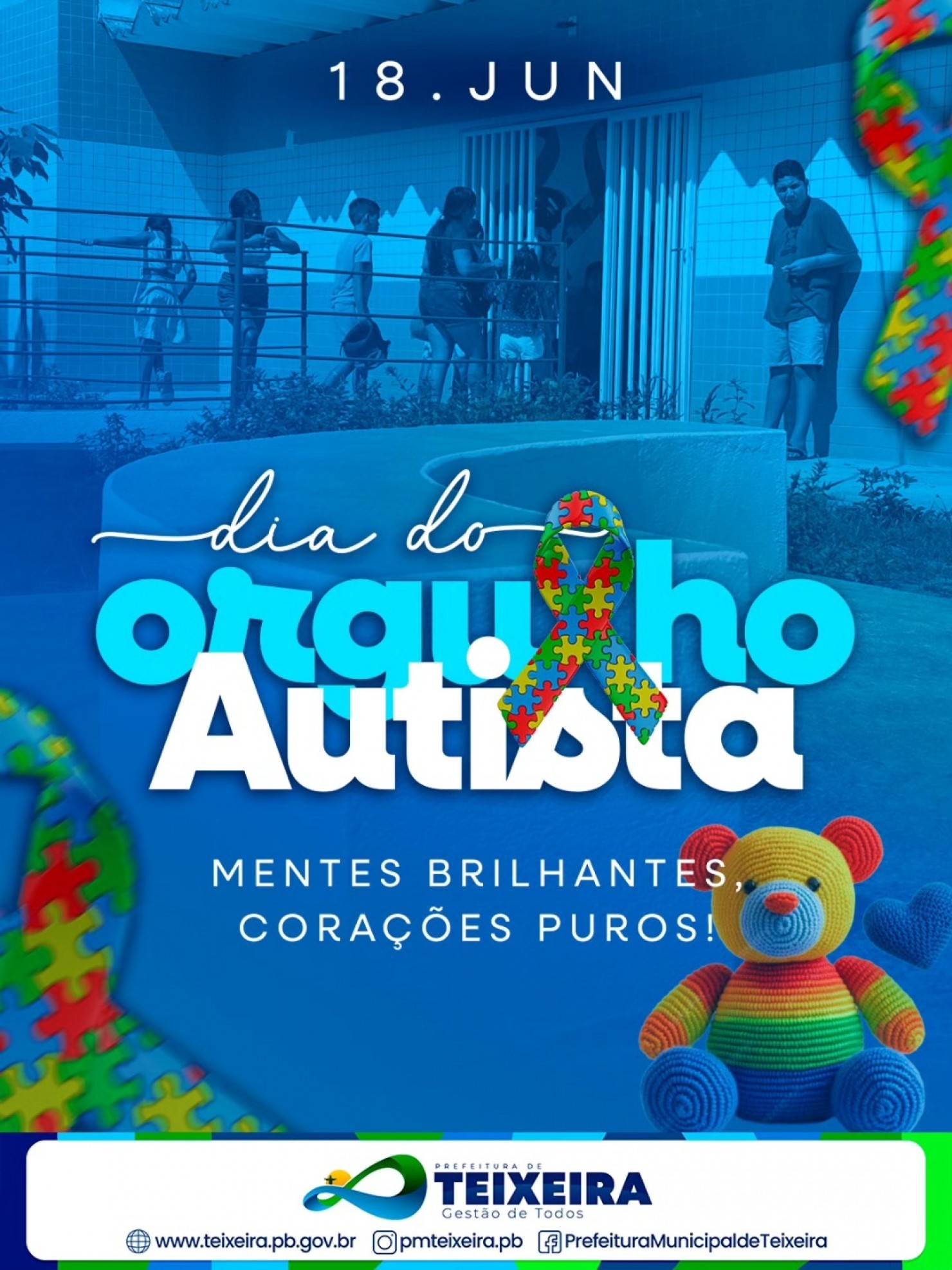 Neste 18 de junho, celebramos o "Dia do Orgulho Autista", uma data que destaca a importância da aceitação e valorização das pessoas autistas em nossa sociedade. A gestão municipal se orgulha em apoiar essa causa, promovendo ações que visam aumentar a conscientização e o respeito à diversidade.