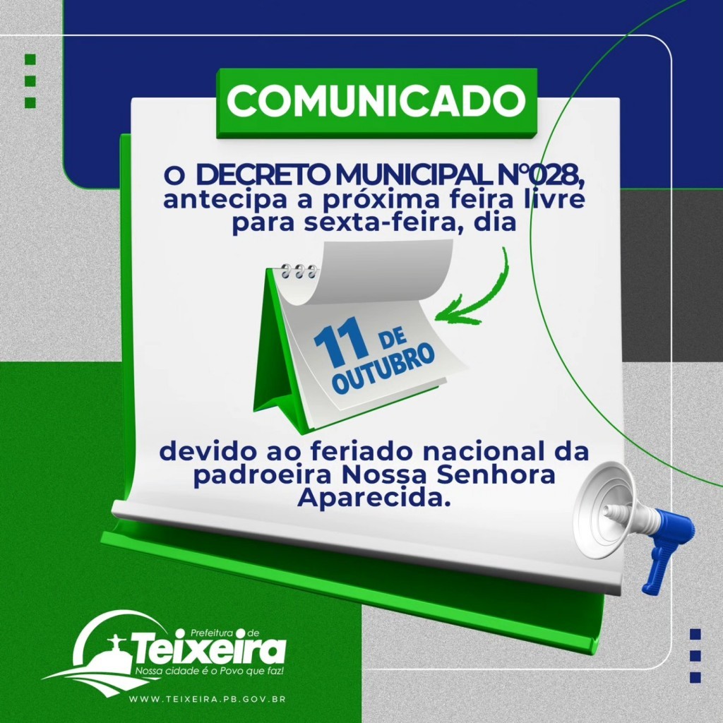 Atenção feirantes e consumidores, de acordo com o Decreto Municipal N⁰ 028, a Prefeitura de Teixeira, por meio da secretaria de planejamento, informa que a feira livre desta semana será antecipada para a próxima sexta-feira, 11 de outubro, devido ao feriado nacional da padroeira do Brasil, Nossa Senhora Aparecida.
