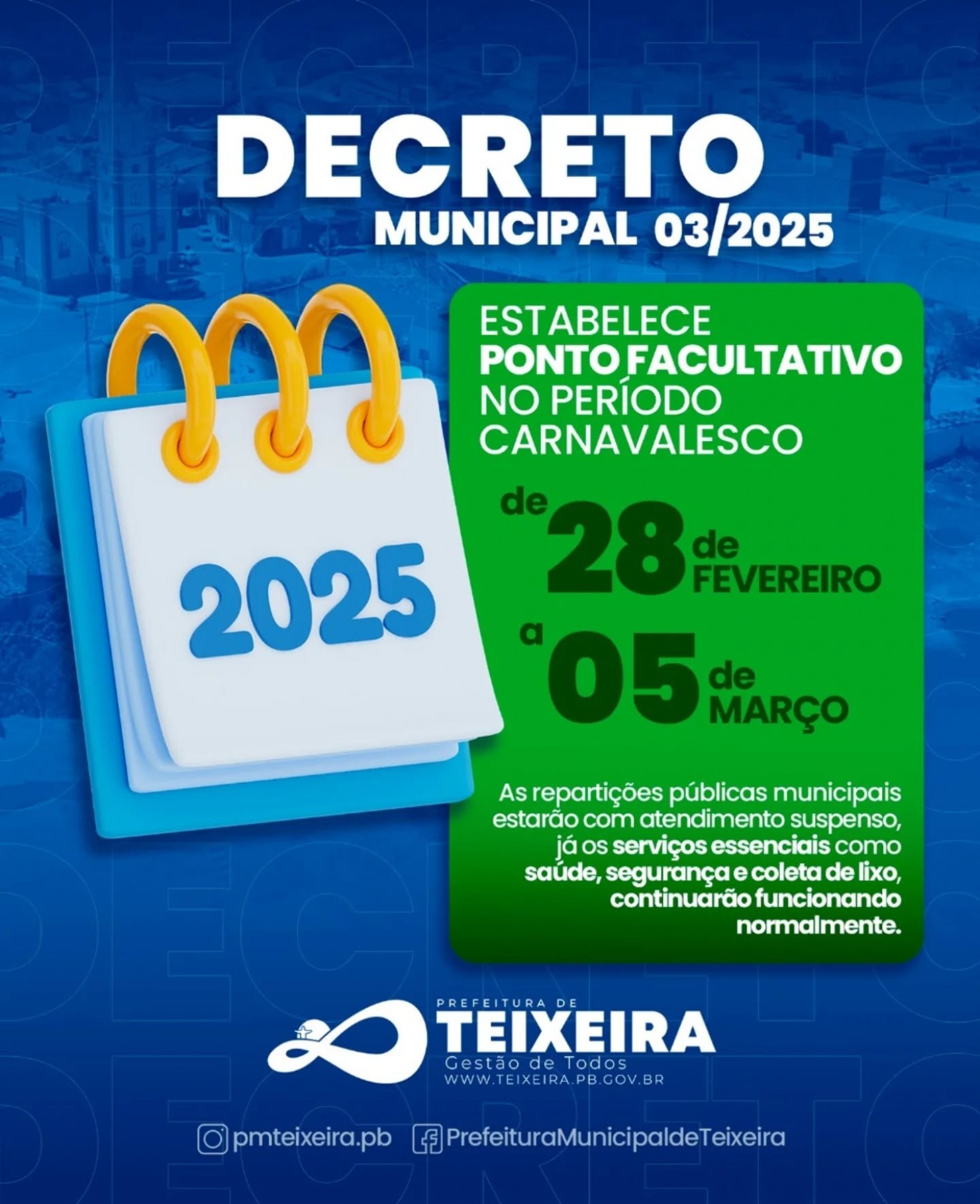 A Prefeitura de Teixeira informa à população que, em razão do período carnavalesco, haverá recesso administrativo entre os dias 28 de fevereiro a 5 de março.