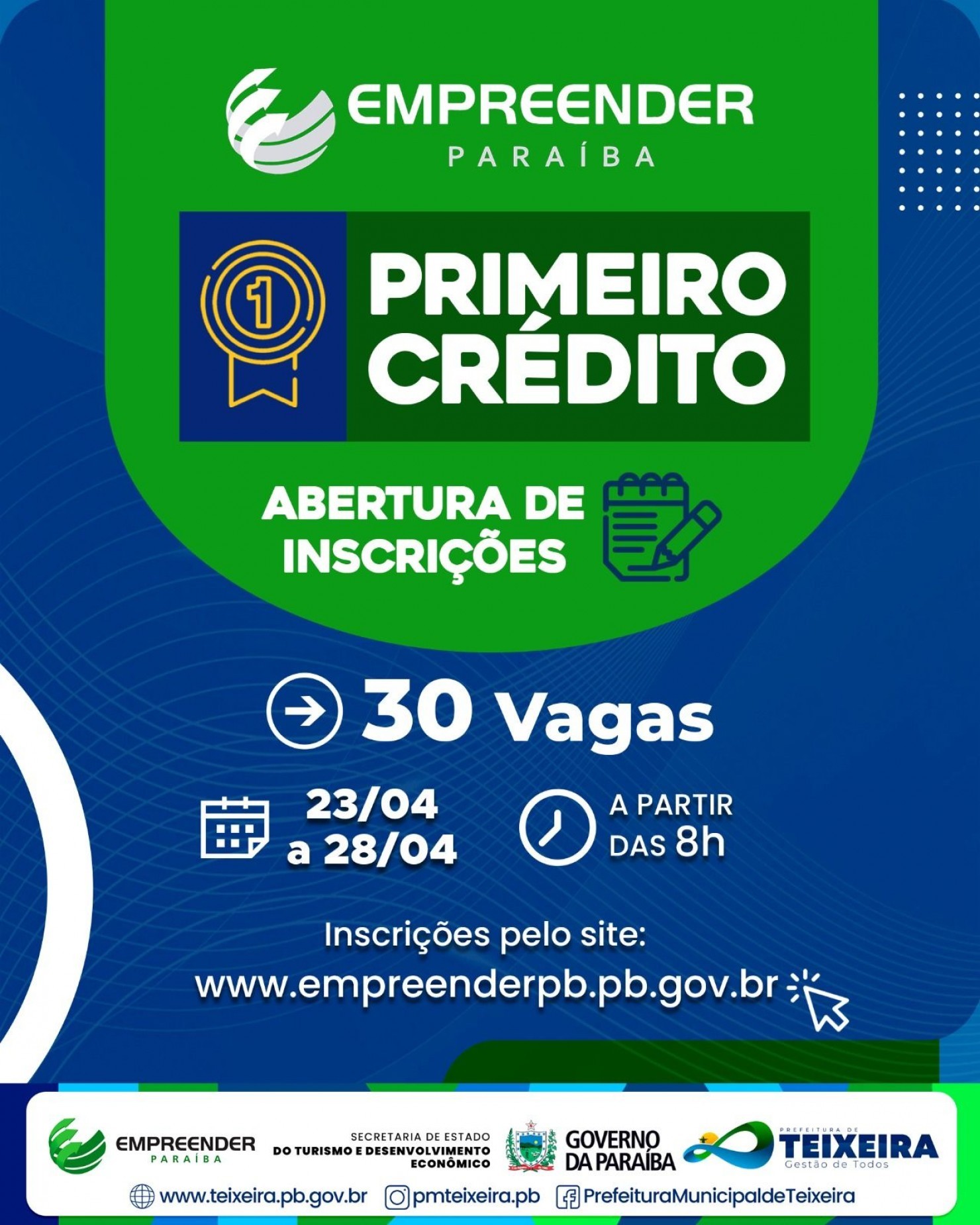 Em Teixeira, os interessados poderão se inscrever através do site www.empreender.pb.gov.br em uma das seguintes modalidades: Empreender Pessoa Física (15), Empreender Juventudes (10), Empreender Profissional Liberal (3) e Empreender Profissional Liberal Juventudes (2).