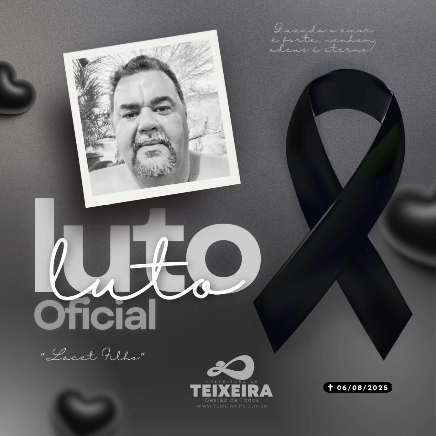 O prefeito Wenceslau Marques, decreta luto oficial de 3 dias no município de Teixeira, em sinal de pesar e respeito pelo falecimento do senhor Valdeci Nunes Lacet Filho, ocorrido nesta quarta-feira, 6 de agosto de 2025.