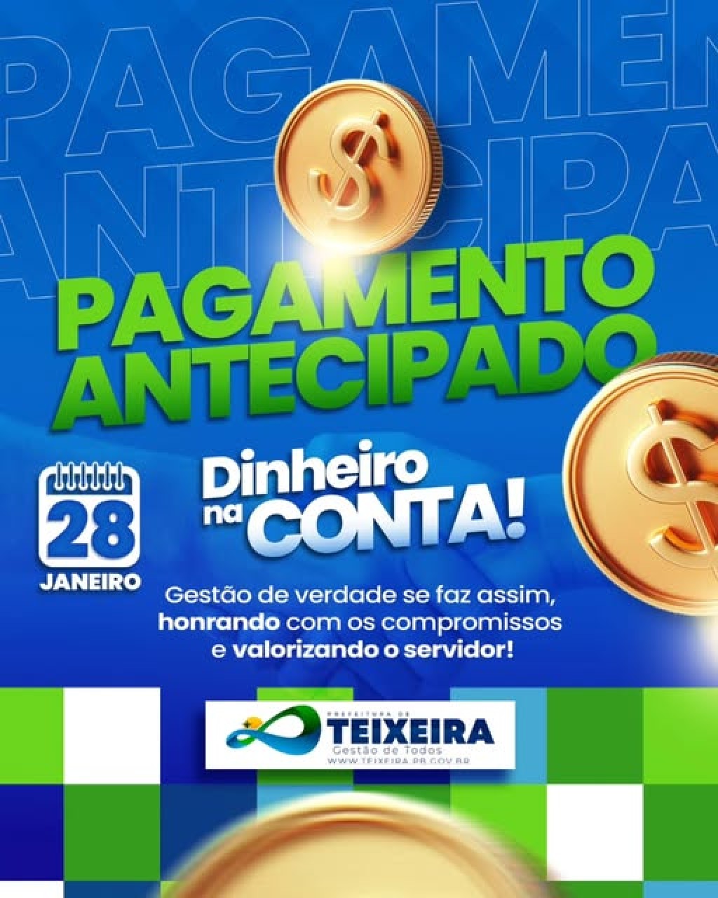 Com o início do governo "Gestão de todos", a Prefeitura de Teixeira por meio da secretaria de finanças realiza nesta terça-feira, 28 de janeiro, o primeiro pagamento mensal do ano de 2025.