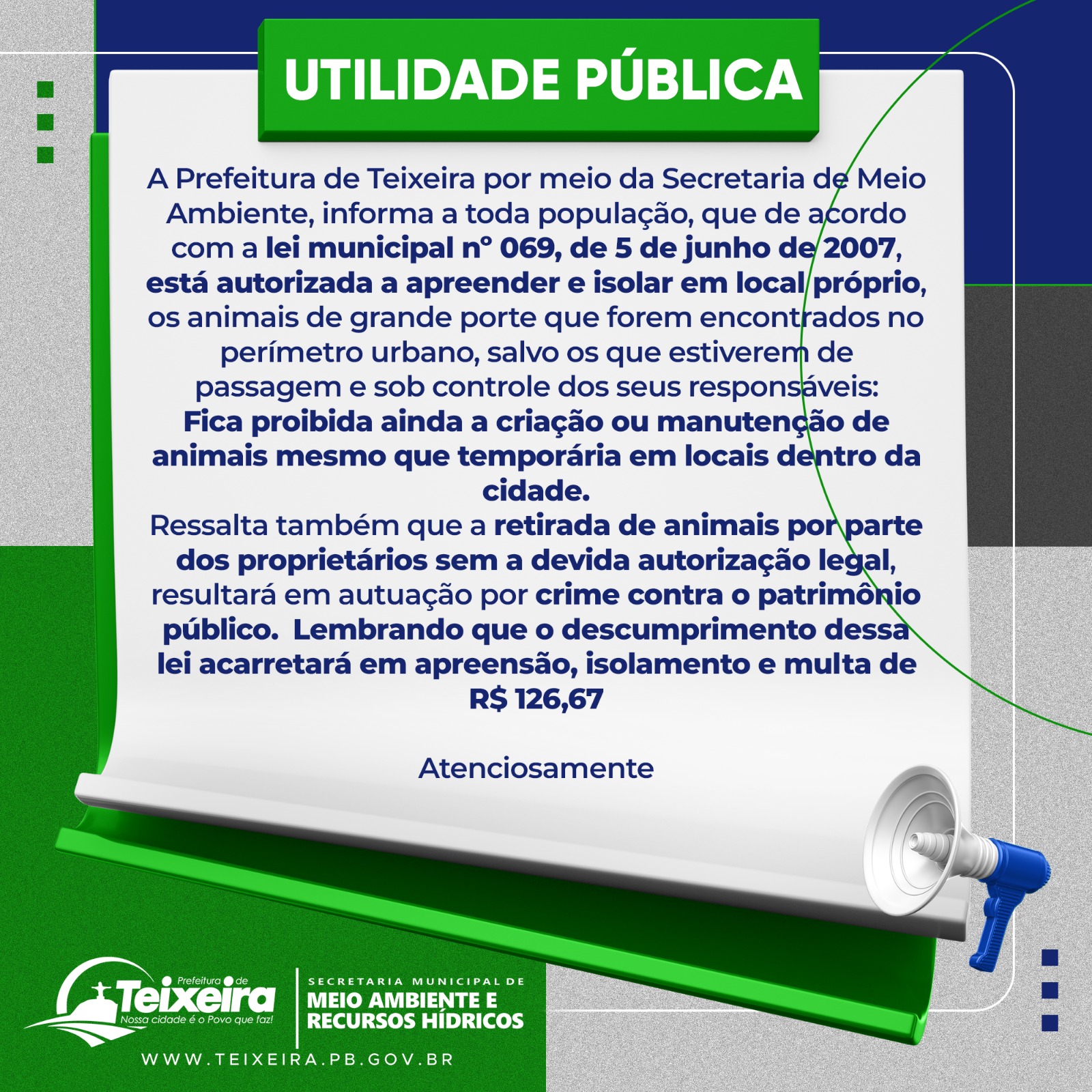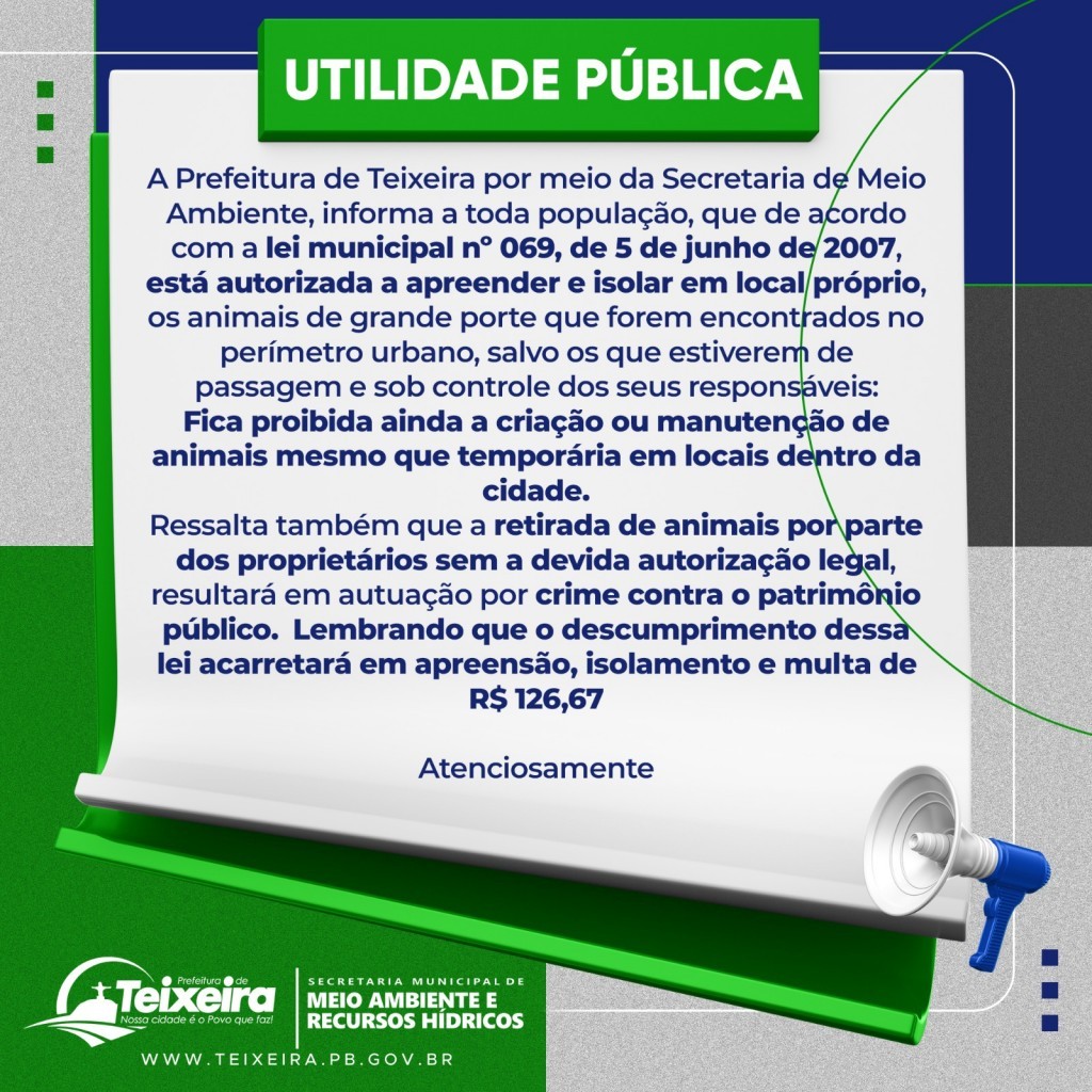 De acordo com a Lei municipal Nº 069, datada em 5 de junho de 2007, a Prefeitura de Teixeira por meio da secretaria de meio ambiente, informa a população que está autorizada a apreender e isolar em local próprio, animais de grande porte que forem encontrados no perímetro urbano, salvo os que estiverem de passagem e sob controle dos seus responsáveis; fica proibida ainda a criação ou manutenção de animais mesmo que temporariamente em locais dentro da cidade.