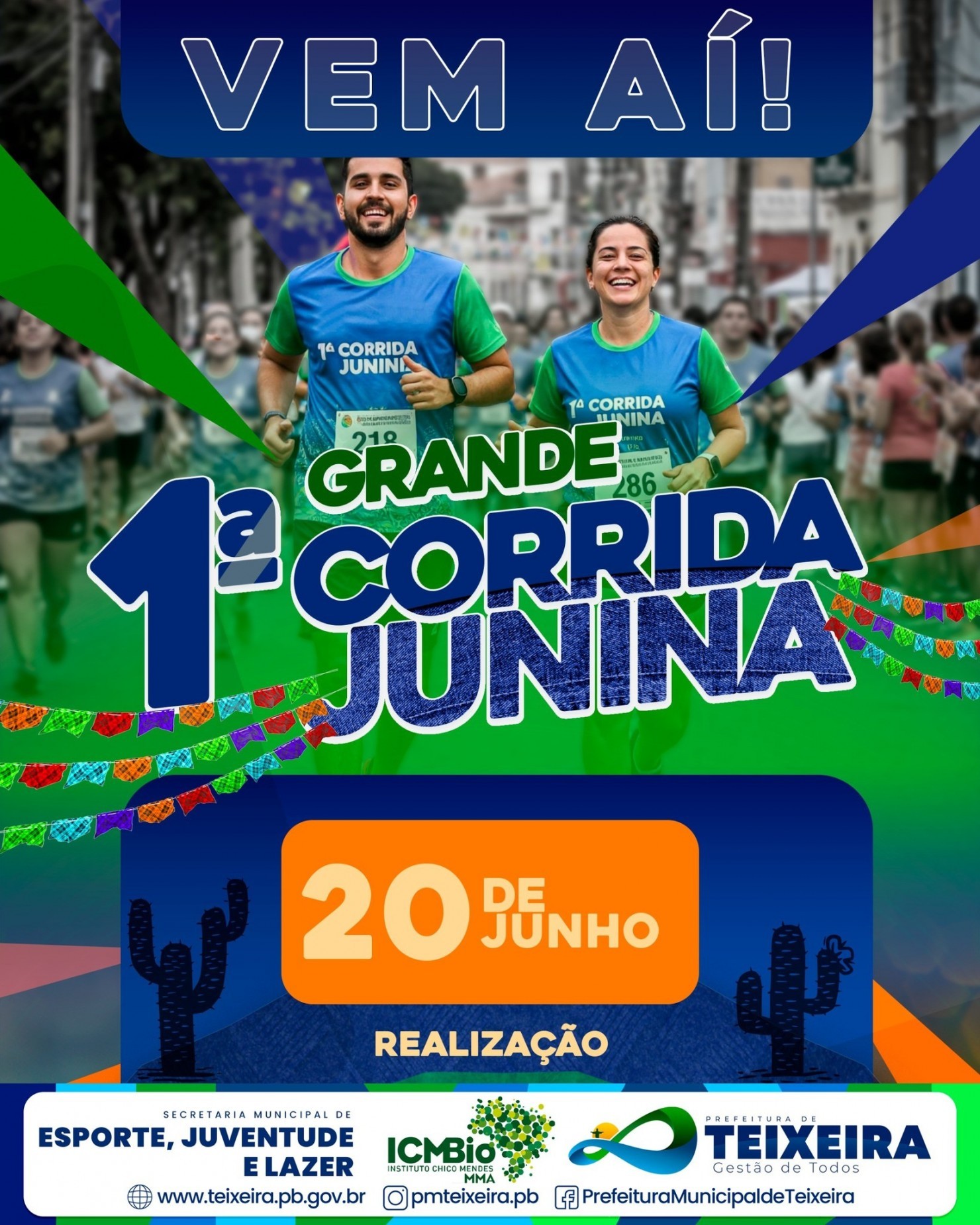 A 1ª grande corrida junina, será um momento de celebração da força e do bem-estar de quem busca qualidade de vida através da corrida. Uma realização da prefeitura de Teixeira, por meio da Secretaria de Esporte e Lazer, com o apoio do ICMBio, unindo atividade física ao clima festivo que a gente tanto ama.