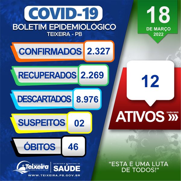 A Prefeitura Municipal de Teixeira-PB, sob a administração do Prefeito Wenceslau Marques, através da Secretaria Municipal de Saúde, Secretaria Municipal de Comunicação e Coordenação Epidemiológica, divulga novo BOLETIM EPIDEMIOLÓGICO DA COVID-19.
