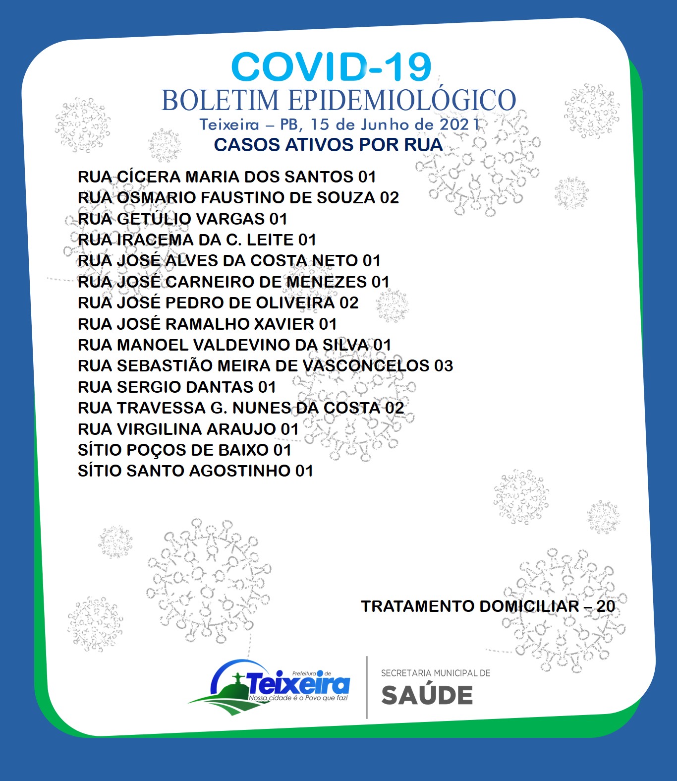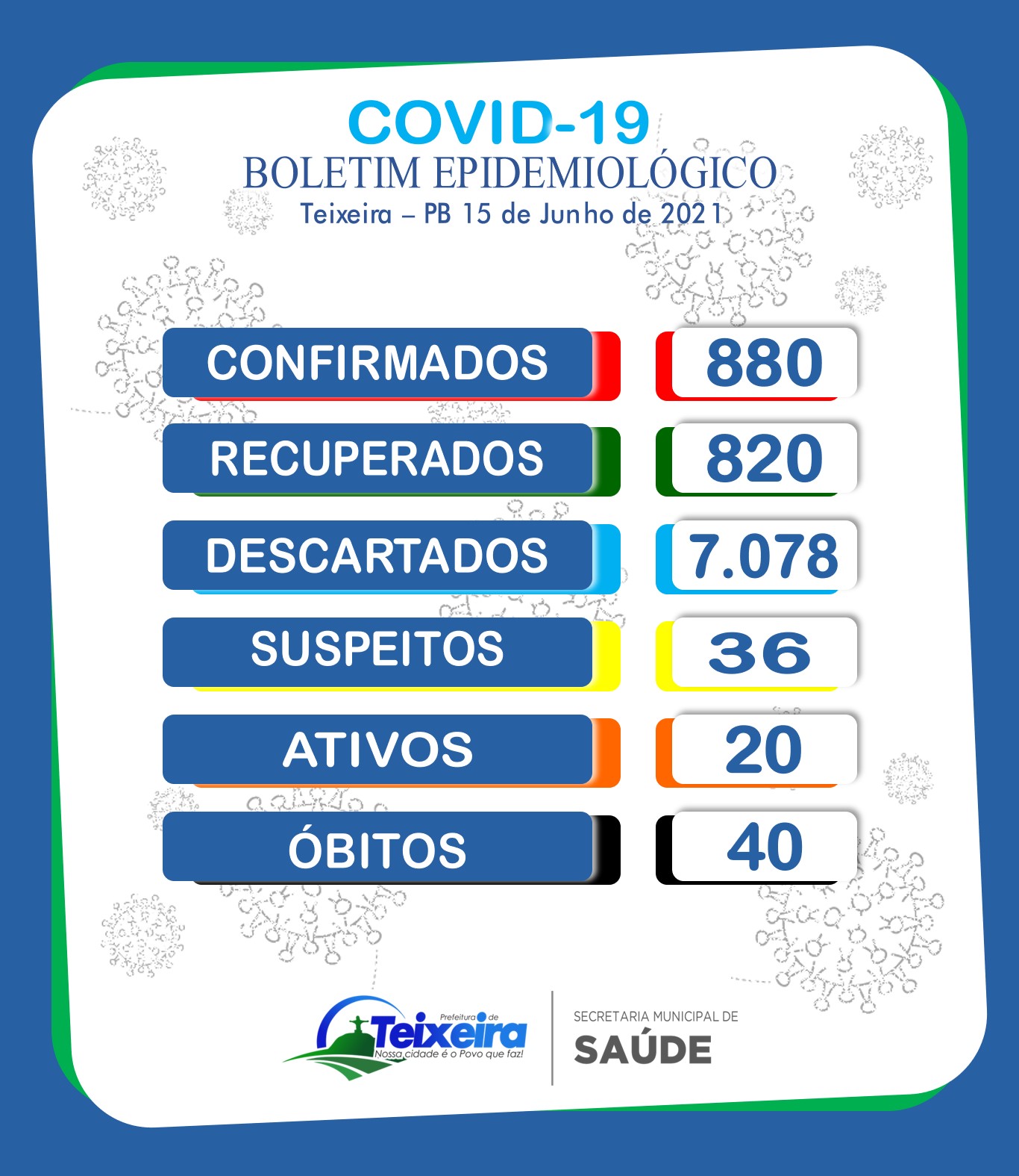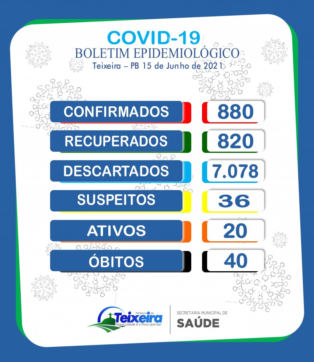 A Prefeitura Municipal de Teixeira-PB, sob a administração do Prefeito Wenceslau Marques, através da Secretaria Municipal de Saúde, Secretaria Municipal de Comunicação e Coordenação Epidemiológica, divulga novo BOLETIM EPIDEMIOLÓGICO DA COVID-19.