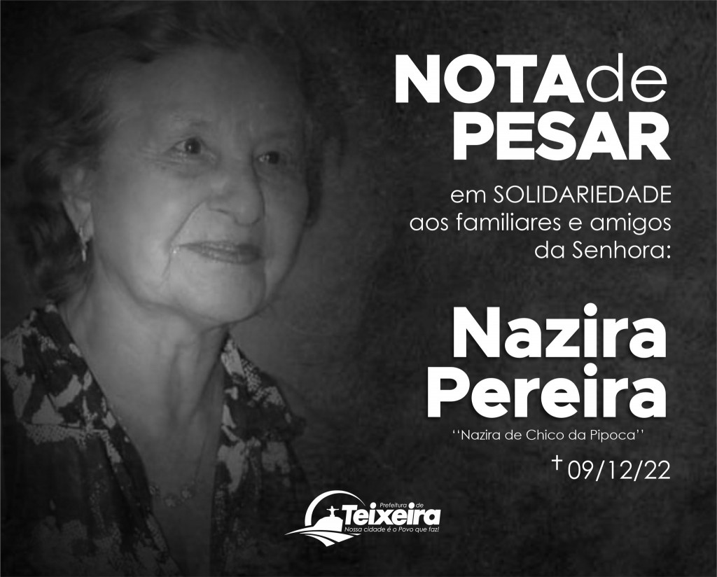 A Prefeitura Municipal de Teixeira-PB, por meio da presente NOTA, vem a público manifestar profundo pesar e condolências aos familiares e amigos da senhora, Nazira Pereira da Nóbrega, mais conhecida por “Dona Nazira de Chico da Pipoca”, pelo o seu falecimento, ocorrido nesta sexta-feira, dia 09 de dezembro de 2022.
